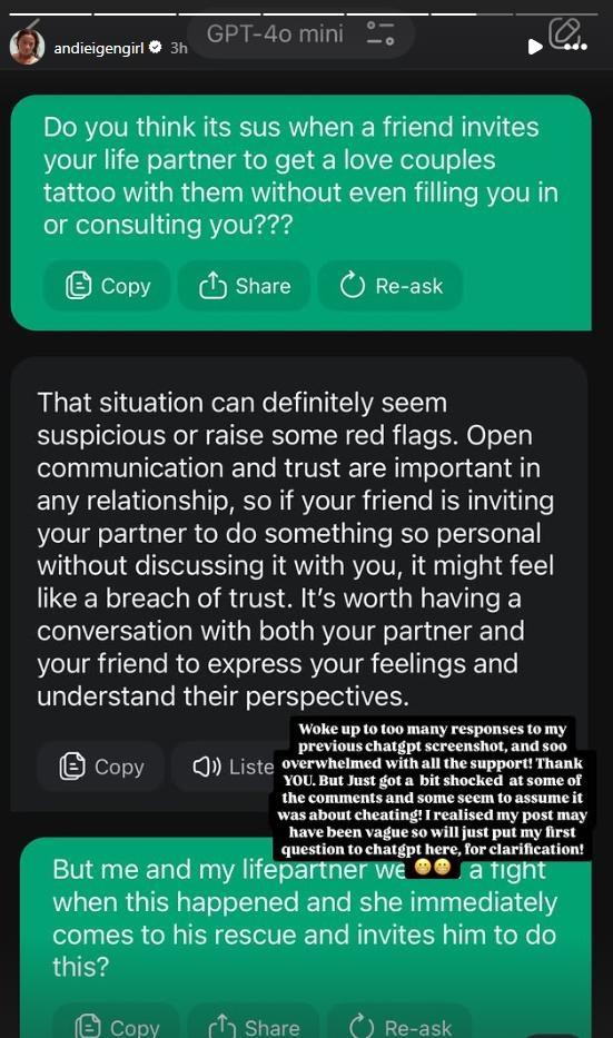 Andi also shared a screenshot of her messages seeking opinions online about a friend wanting to have a couple tattoo with someone taken.