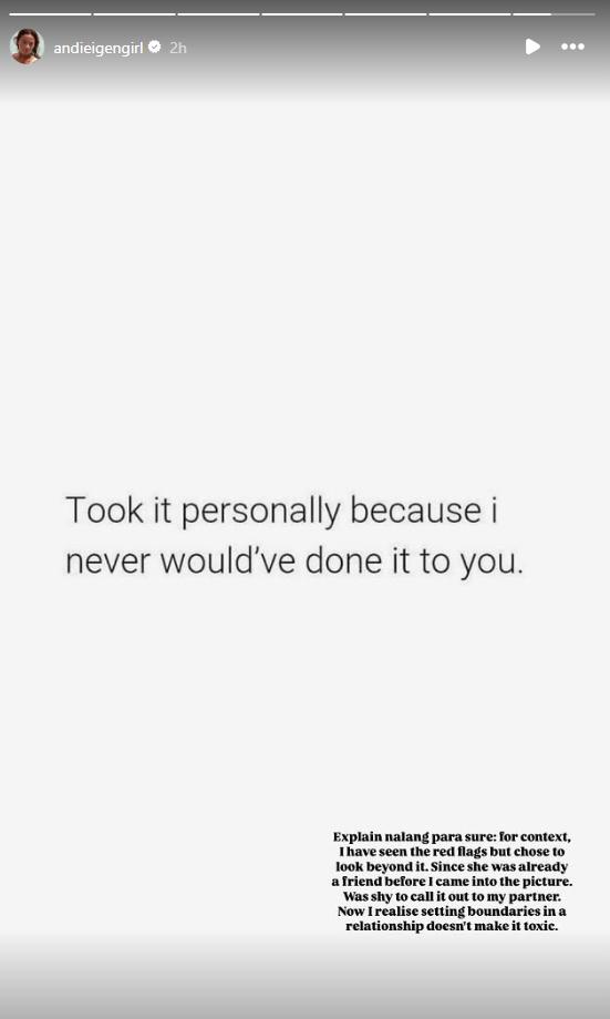 In another Instagram story, Andi clarified that a friend was behind her cryptic messages. She explained that while she had noticed some red flags with the friend, she respected their long relationship with Philmar. However, she eventually realized that it's not toxic to set boundaries in a relationship.