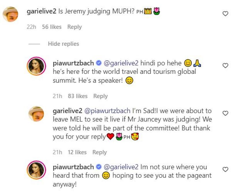 Meanwhile, other fans welcome Jeremy to the Philippines on Pia's Instagram account.