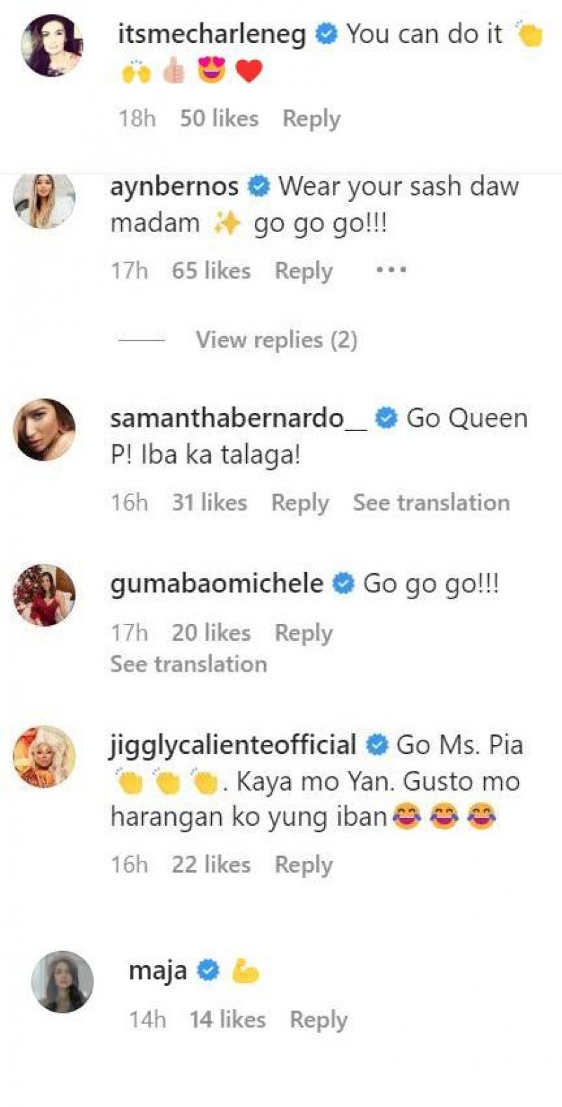 Pia's followers and celebrity friends quickly flooded the comments of her Instagram post with encouragement. Some of the celebrities in the comments include beauty queens Charlene Gonzales, Ayn Bernos, Samantha Bernardo, and Michele Gumabao. Drag Race Philippines judge Jiggly Caliente and actress Maja Salvador also shared encouragement in the comment section.