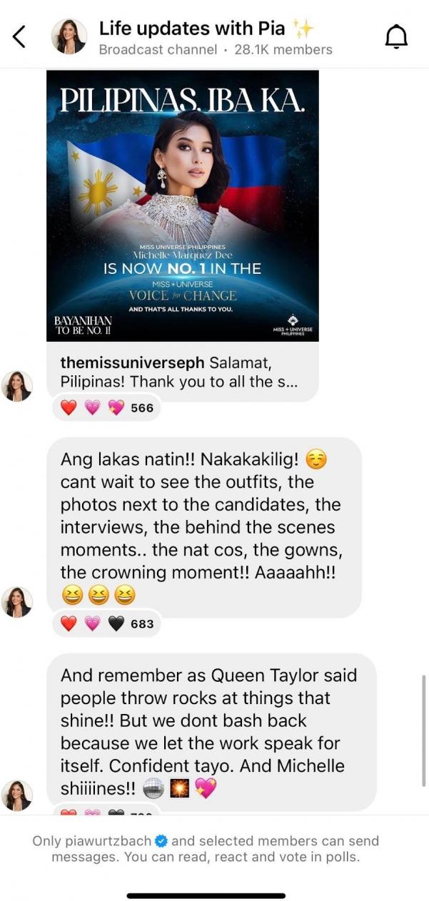 On her Instagram account, Pia shared messages hyping up the Philippines' contender to the Miss Universe pageant.
