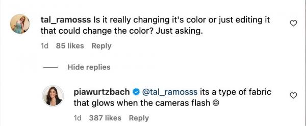 A netizen was both amazed and curious about Pia's dress and whether the colors were real or edited. The beauty queen revealed in the caption that the fabric glows when hit by a camera flash.