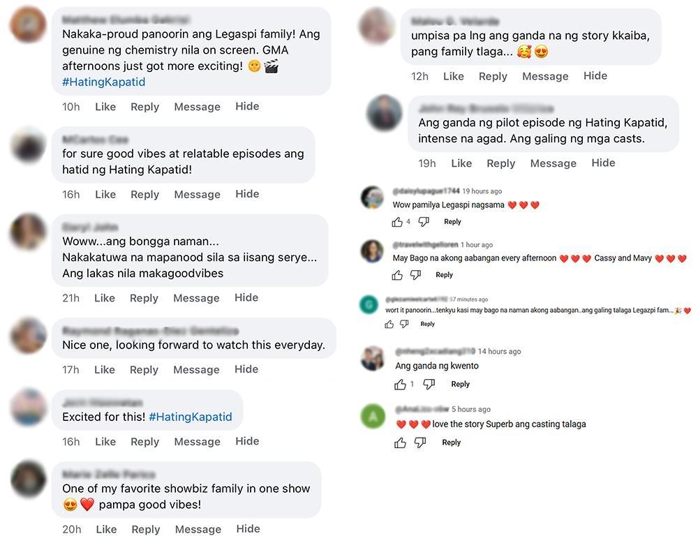 Bukod dito, umani rin ng papuri ang pilot episode ng Hating Kapatid mula sa netizens. Marami ang natuwa sa unang pagsasama-sama ng buong Legaspi family sa isang drama series at sa kuwento nito.