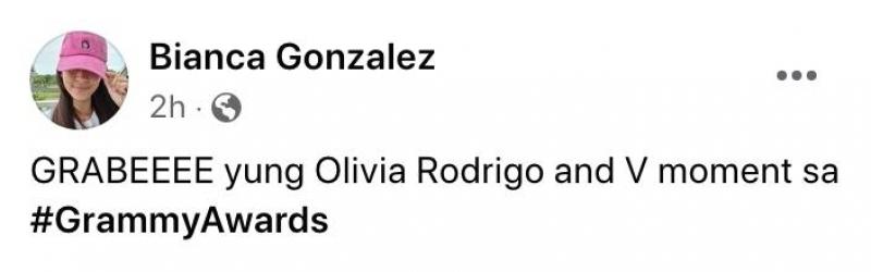 Nabulabog ang maraming Pinoy fans sa viral photos ng pop singer na si Olivia Rodrigo at BTS member na si V o Kim Taehyung sa Grammy Awards 2022 ngayong Lunes, April 4.