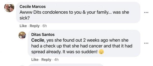 In the comments section, she shared that Pita only found that she had cancer recently and that it was already too late to be treated.