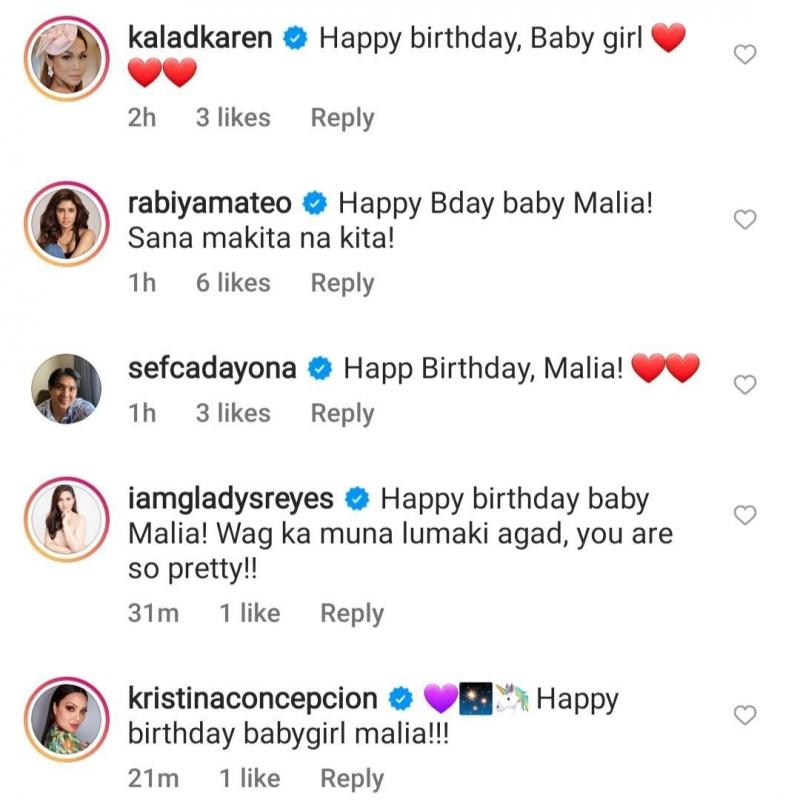 Among those who sent their birthday greetings for the Kapuso star's daughter include impersonator KaladKaren, Pepito Manaloto: Ang Unang Kuwento stars Sef Cadayona and Gladys Reyes, beauty queen-actress Rabiya Mateo, and KC Concepcion.