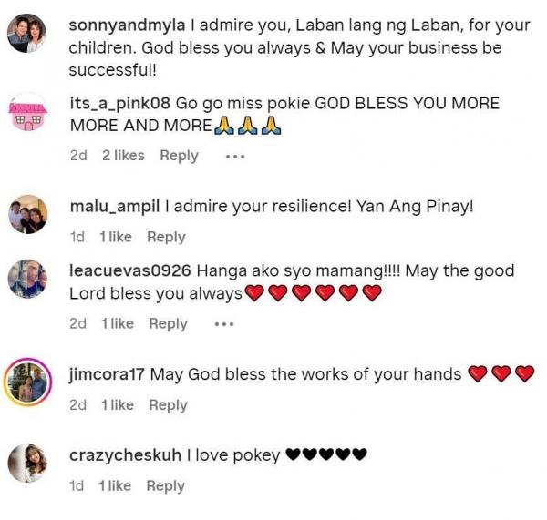 Tumanggap naman ng papuri si Pokwang dahil sa kaniyang pagsisikap na buhayin muli ang kaniyang negosyo. Saad ng isang netizen, "I admire you, Laban lang ng Laban, for your children. God bless you always & May your business be successful!"