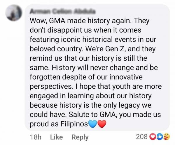 “Wow, GMA made history again. They don't disappoint us when it comes [to] featuring iconic historical events in our beloved country. We're Gen Z, and they remind us that our history is still the same. History will never change and be forgotten despite our innovative perspectives. I hope that youth are more engaged in learning about our history because history is the only legacy we could have. Salute to GMA, you made us proud as Filipinos,” saad ng isang social media user.