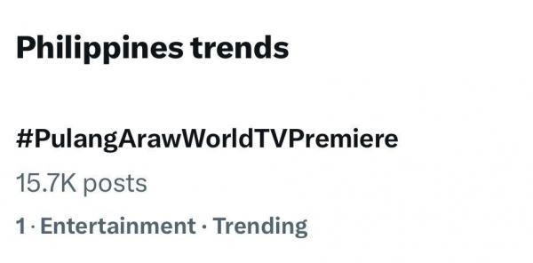 Sa katunayan, nasa number 1 spot ang #PulangArawWorldTVPremiere sa top trending list ng Philippine Trends sa X kagabi, July 29.