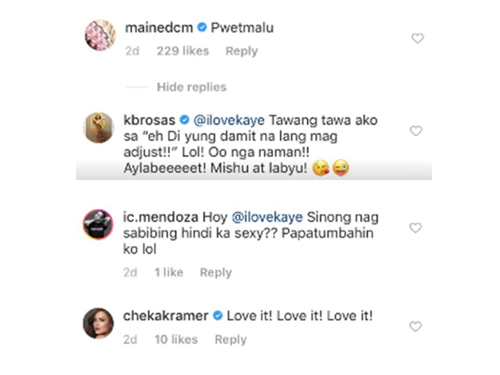 Several celebs reacted to Kakai Bautista's post, including Eat Bulaga host Maine Mendoza, to name a few.