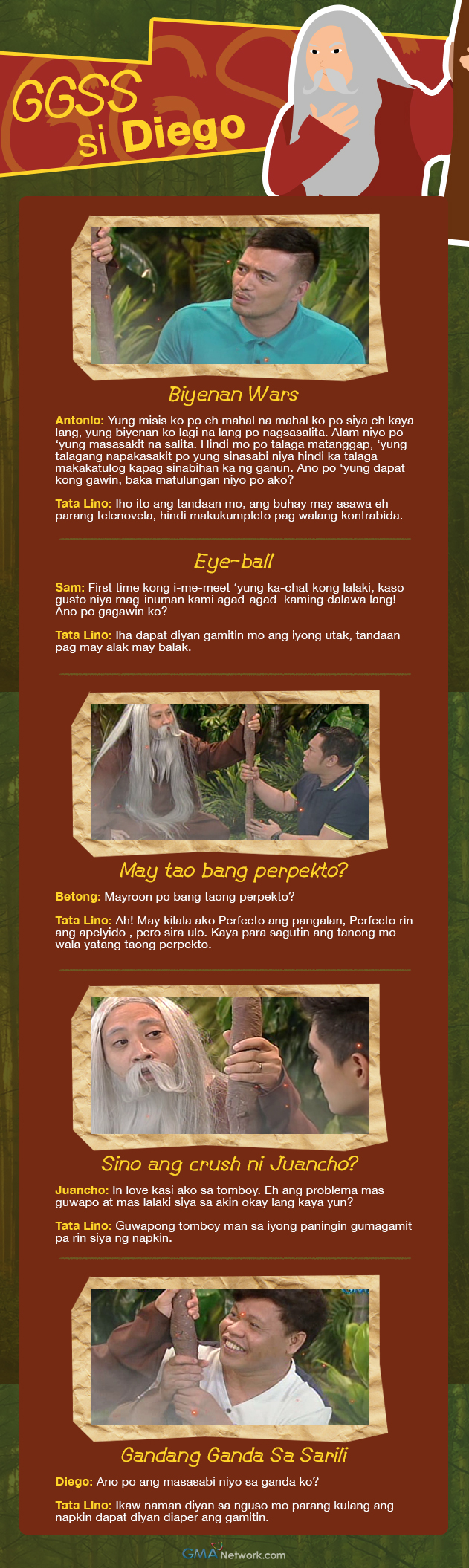 Ano-ano kaya ang mga advice niya sa mga Kababol natin na sina Antonio, Sam, Betong, Juancho at Diego. Malay niyo mga Kapuso, baka makatulong din sa inyo ang mga ito.