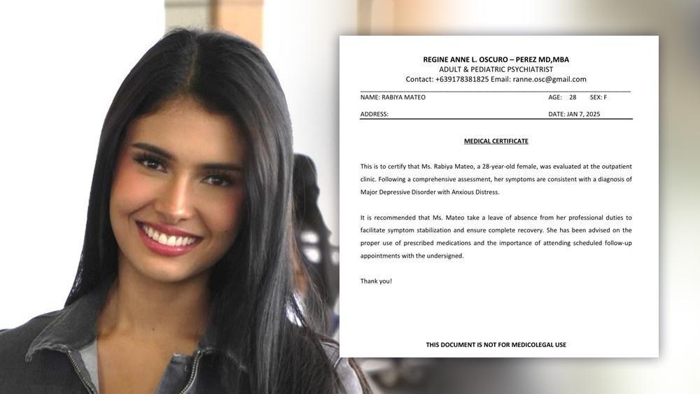 Ibinahagi ni Rabiya Mateo ang isang medical certificate mula sa adult and pediatric psychiatrist Regine Anne L. Oscuro-Perez MD, MBA sa kanyang opisyal na Facebook page, at ayon sa certificate, merong major depressive disorder with anxious distress si Rabiya. Nirekomenda din ng certificate na mag leave of absence si Rabiya mula sa kanyang mga professional duties “to facilitate symptom stabilization and ensure complete recovery”. Maliban sa gamot, meron ding mga follow-up appointments si Rabiya sa doctor.