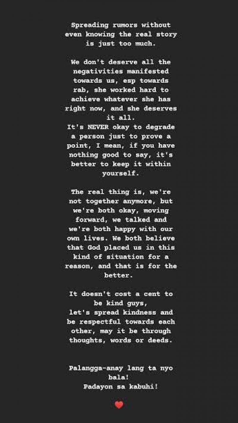 "The real thing is, we're not together anymore, but we're both okay, moving forward, we talked and we're both happy with our own lives," part of his message read.