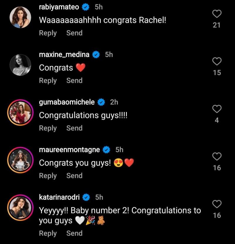 After the announcement of their newest blessing, Rachel and Migz received many love and congratulatory messages from showbiz personalities and beauty queens, including Rabiya Mateo, Maxine Medina, Michele Gumabao, Maureen Montagne, and Katarina Rodriguez in the comments section.