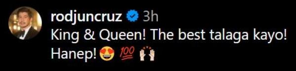 Kapuso actor and brother Rodjun Cruz proudly praised the couple on Instagram with the comment "King & Queen! The best talaga kayo! Hanep!"
