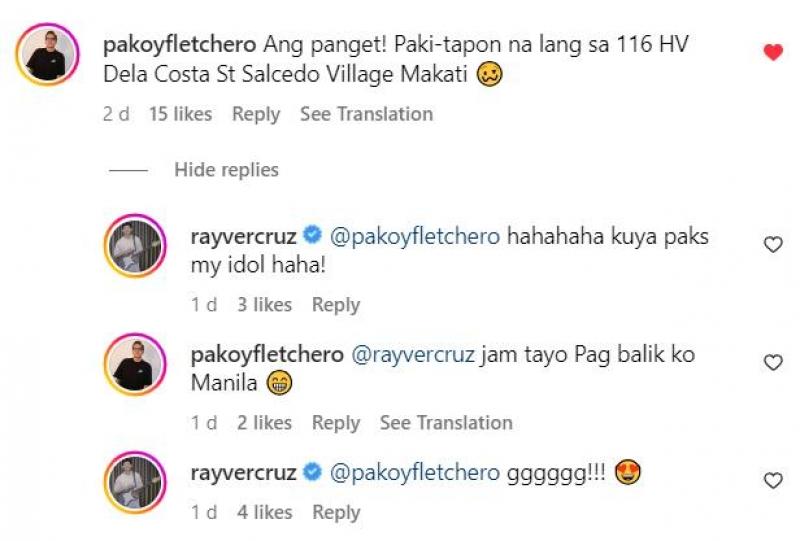 He commented, "Ang panget! Paki-tapon na lang sa XXX HV Dela Costa St Salcedo Village Makati," to which Rayver replied, "@pakoyfletchero hahahaha kuya paks my idol haha!"
