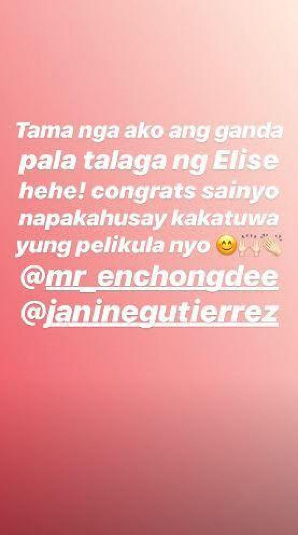 He said in his Instagram stories, “Tama nga ako ang ganda pala talaga ng Elise hehe! Congrats sa inyo napakahusay, nakakatuwa 'yung pelikula niyo. @mrenchongdee @janinegutierrez