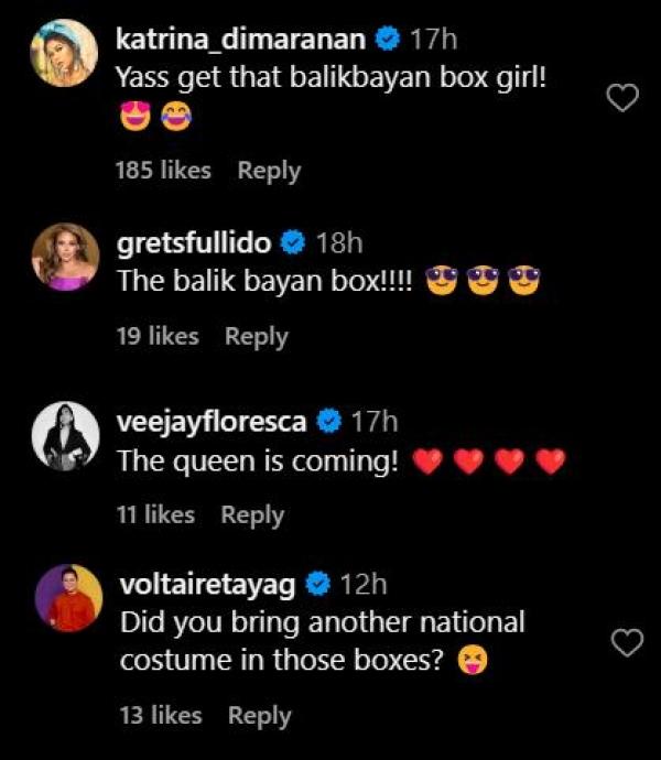 Filipino personalities and ordinary netizens immediately talked about the balikbayan box in the comment section. Celebrities include fellow beauty queen Katrina Dimaranan, reporter Gretchen Fullido, designer Veejay Floresca, and Miss Universe Philippines director of communication Voltaire Tayag.