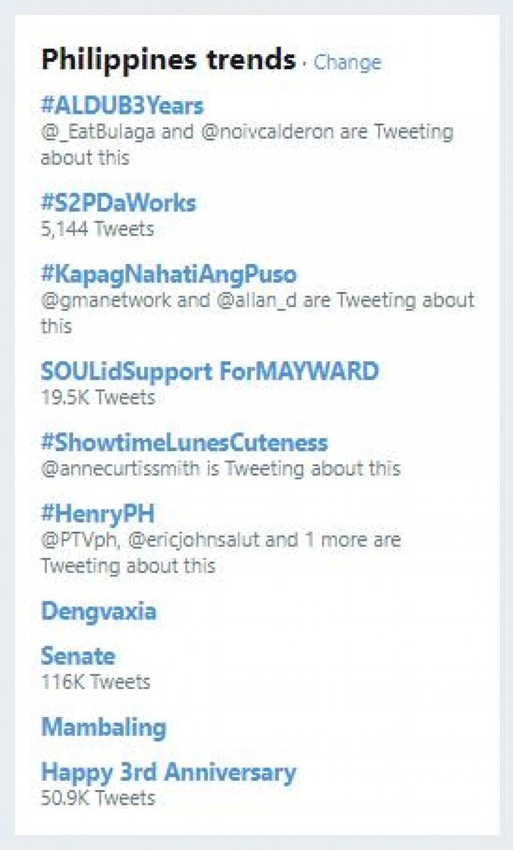 What’s more, the hashtag #ALDUB3Years was the top trending topic in Twitter Philippines.