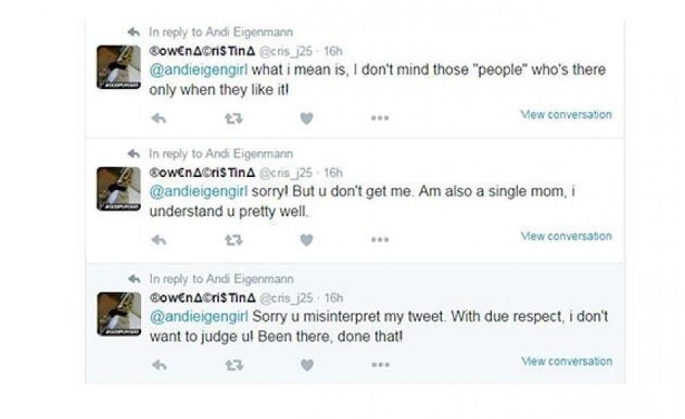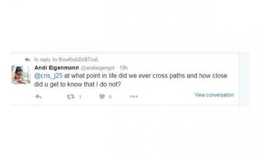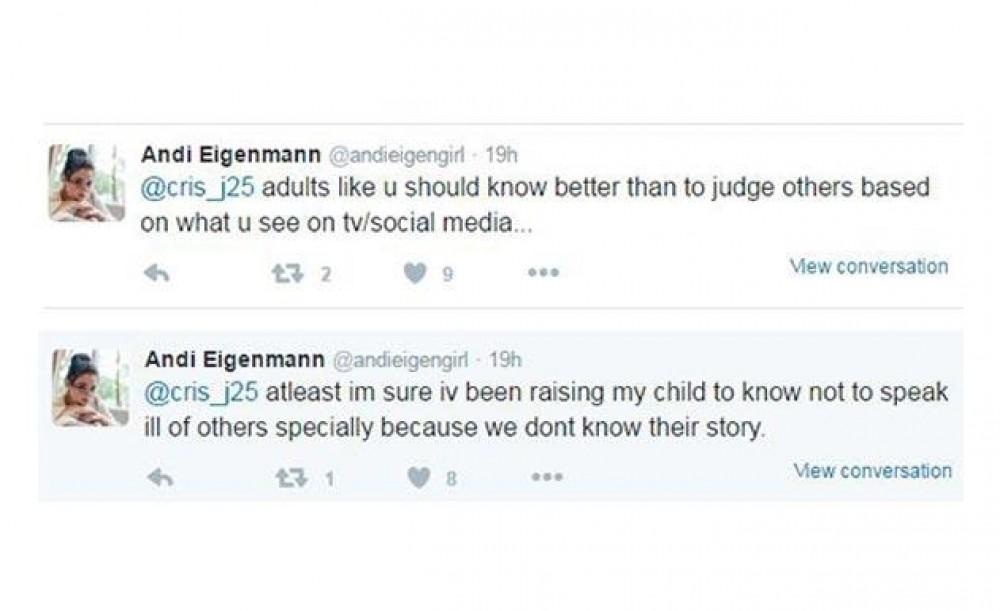 Twitter user @cris_j25 posted this comment advising Andi, “if i were @andieigengirl i'd rather she focus her thoughts & energy to her career & daughter!”