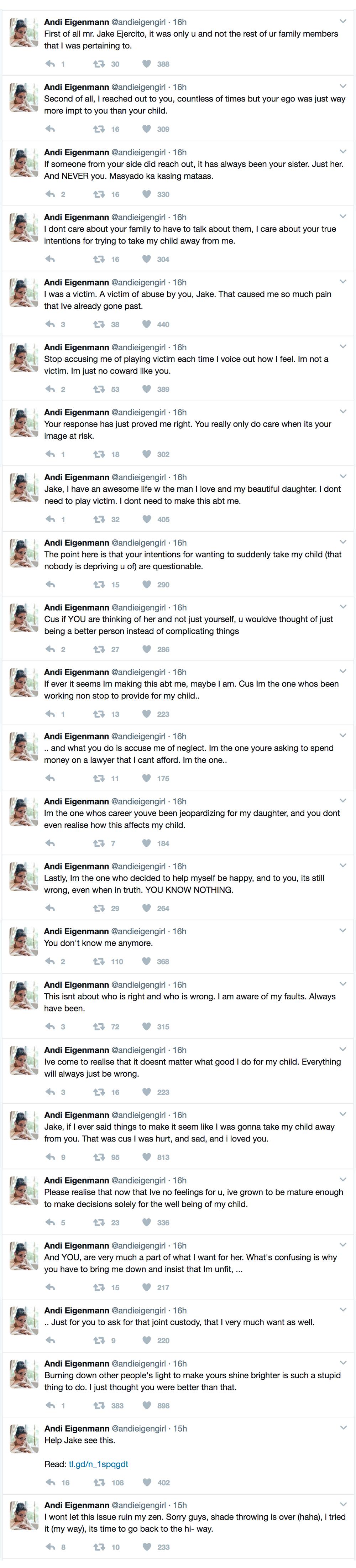 Agad na sinagot ni Andi Eigenmann ang statement na inilabas ni Jake Ejercito sa kanyang Twitter account. Pagsisimula ni Andi sa kanyang post, "First of all mr. Jake Ejercito, it was only you and not the rest of your family members that I was pertaining to."