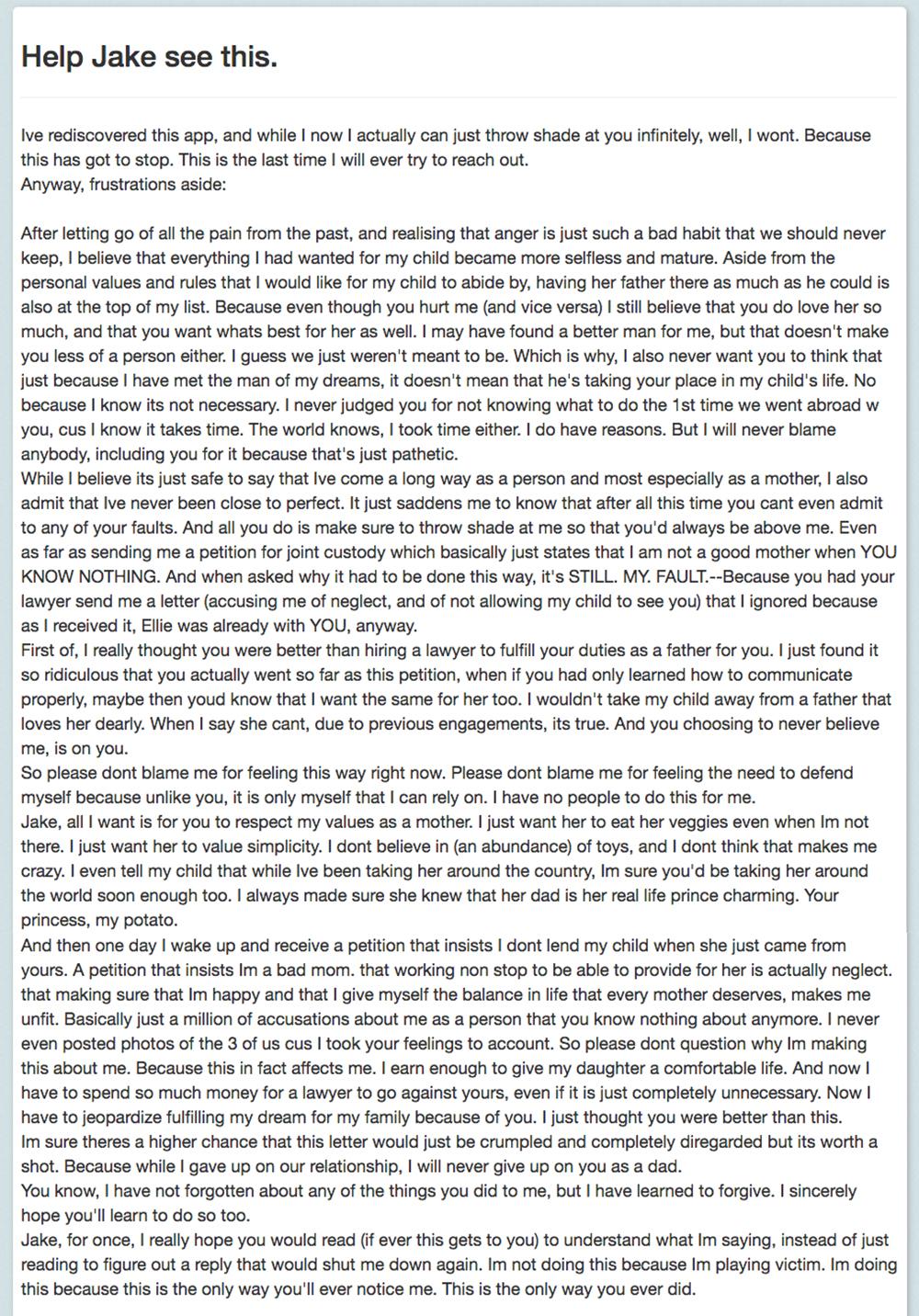 Sa huli ay nagbigay ng link ang aktres at nais niyang humingi ng tulong sa kanyang followers na maipakita 'yun kay Jake. Sa loob nito ay isang mensahe na nais niyang ibigay sa kanyang ex-boyfriend at ama ni Ellie.