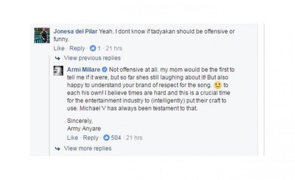Isang Facebook user na si Jonesa del Pilar ang nagtanong sa lead vocalist ng Up Dharma Down na si Armi Millare kung na-offend ba siya sa ginawang pag-spoof ng show sa kanyang kanta.