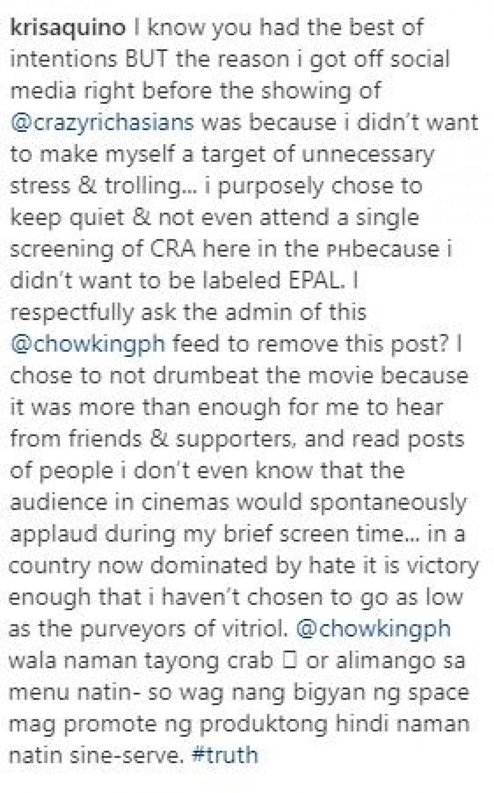 Paliwanag ni Kris, “I chose to not drumbeat the movie because it was more than enough for me to hear from friends & supporters, and read posts of people I don't even know that the audience in cinemas would spontaneously applaud during my brief screen time…in a country now dominated by hate, it is victory enough that I haven't chosen to go as low as the purveyors of vitriol. @chowkingph wala naman tayong crap or alimango sa menu natin--so 'wag nang bigyan ng space mag-promote ng produktong hindi naman natin sini-serve. #truth.”