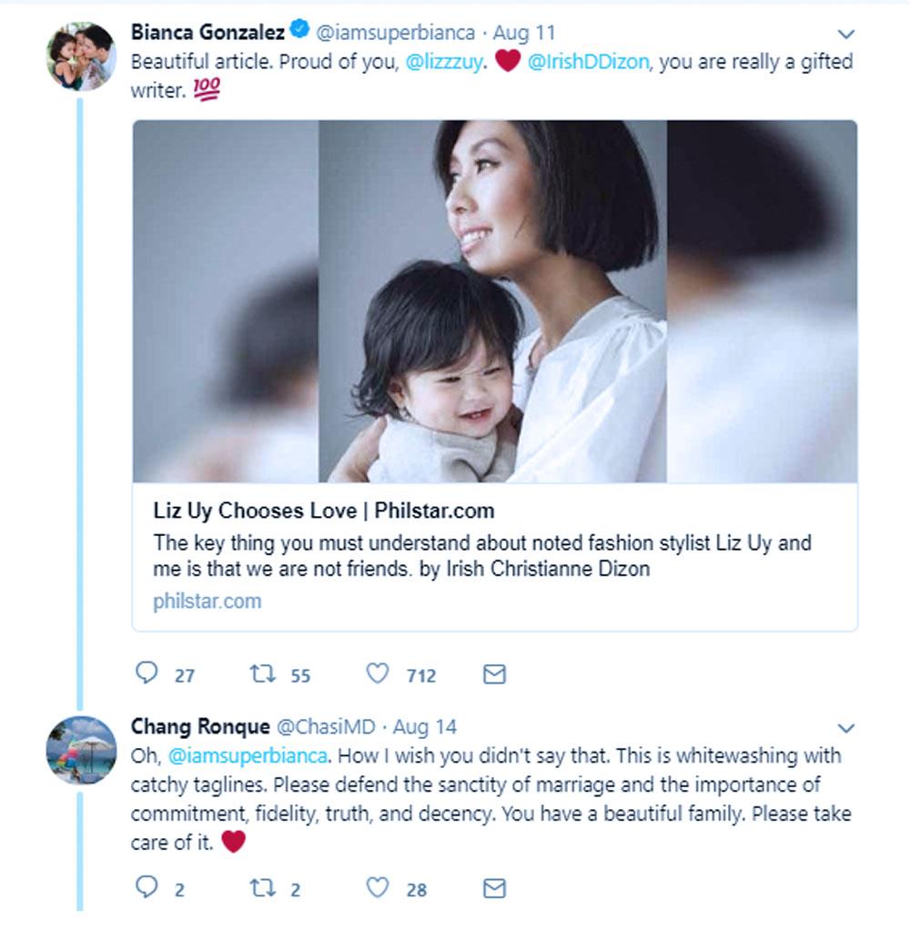 One of the celebrities who expressed support for Liz is Kapamilya TV host Bianca Gonzalez who tweeted that she's proud of the stylist mom.