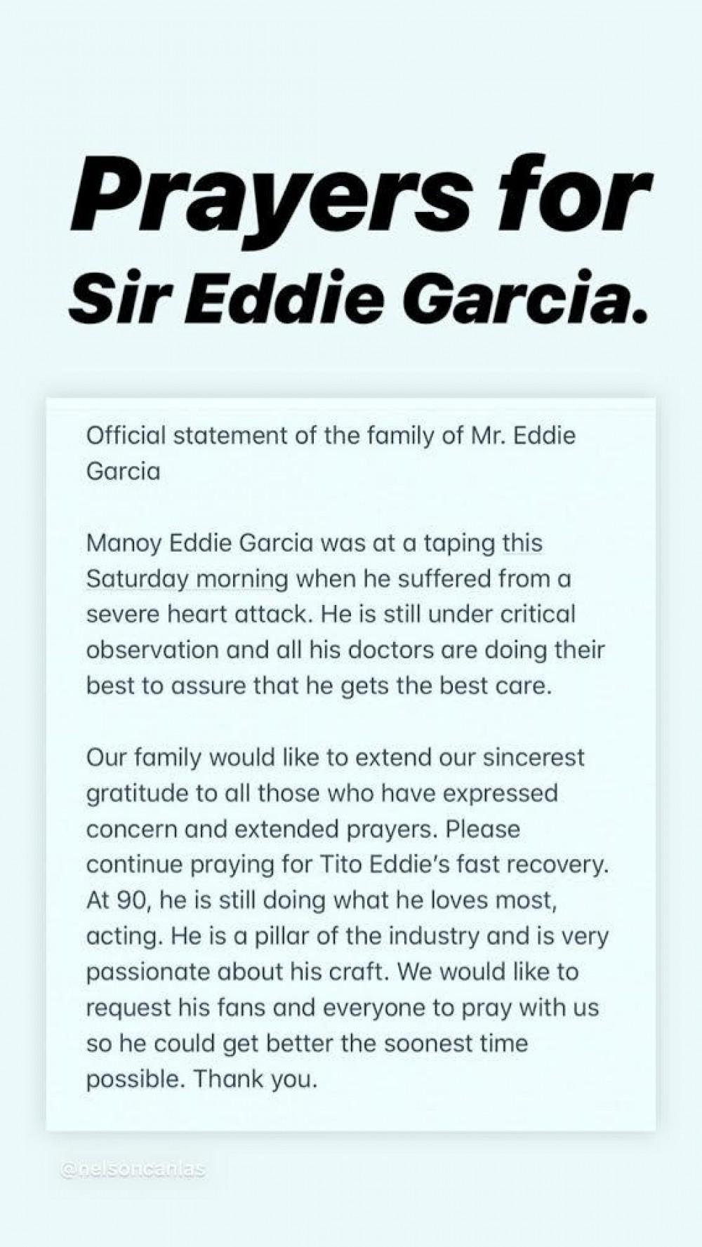 Celebrities from different networks unite in prayer for the speedy recovery of acclaimed actor-director Eddie Garcia.