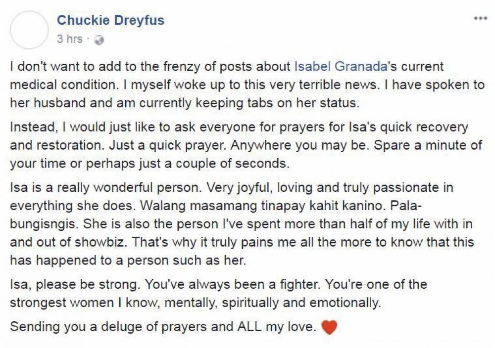 "I don't want to add to the frenzy of posts about Isabel Granada's current medical condition. I myself woke up to this very terrible news. I have spoken to her husband and am currently keeping tabs on her status. Instead, I would just like to ask everyone for prayers for Isa's quick recovery and restoration. Just a quick prayer. Anywhere you may be. Spare a minute of your time or perhaps just a couple of seconds," saad ni Chuckie sa kanyang Facebook post.