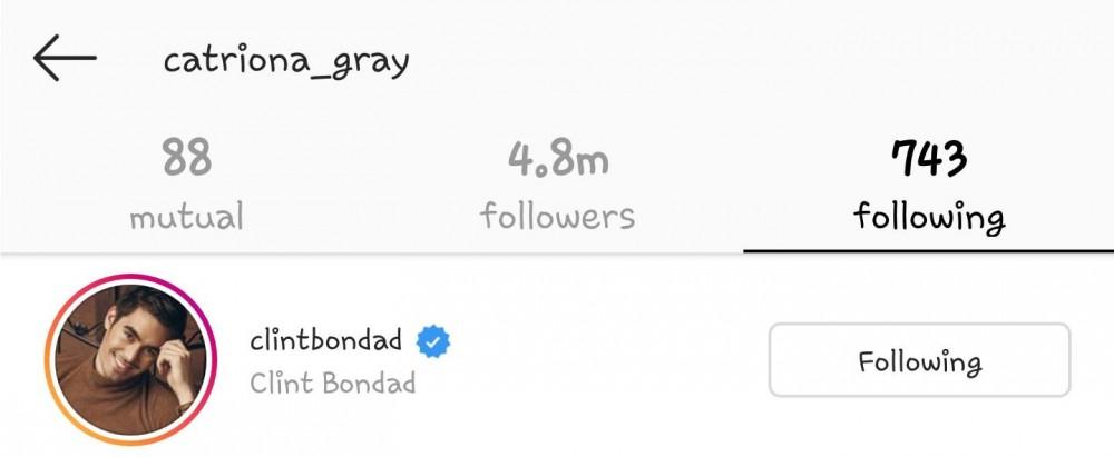 As of posting time, Clint is not following anyone on Instagram anymore but Catriona still follows Clint.