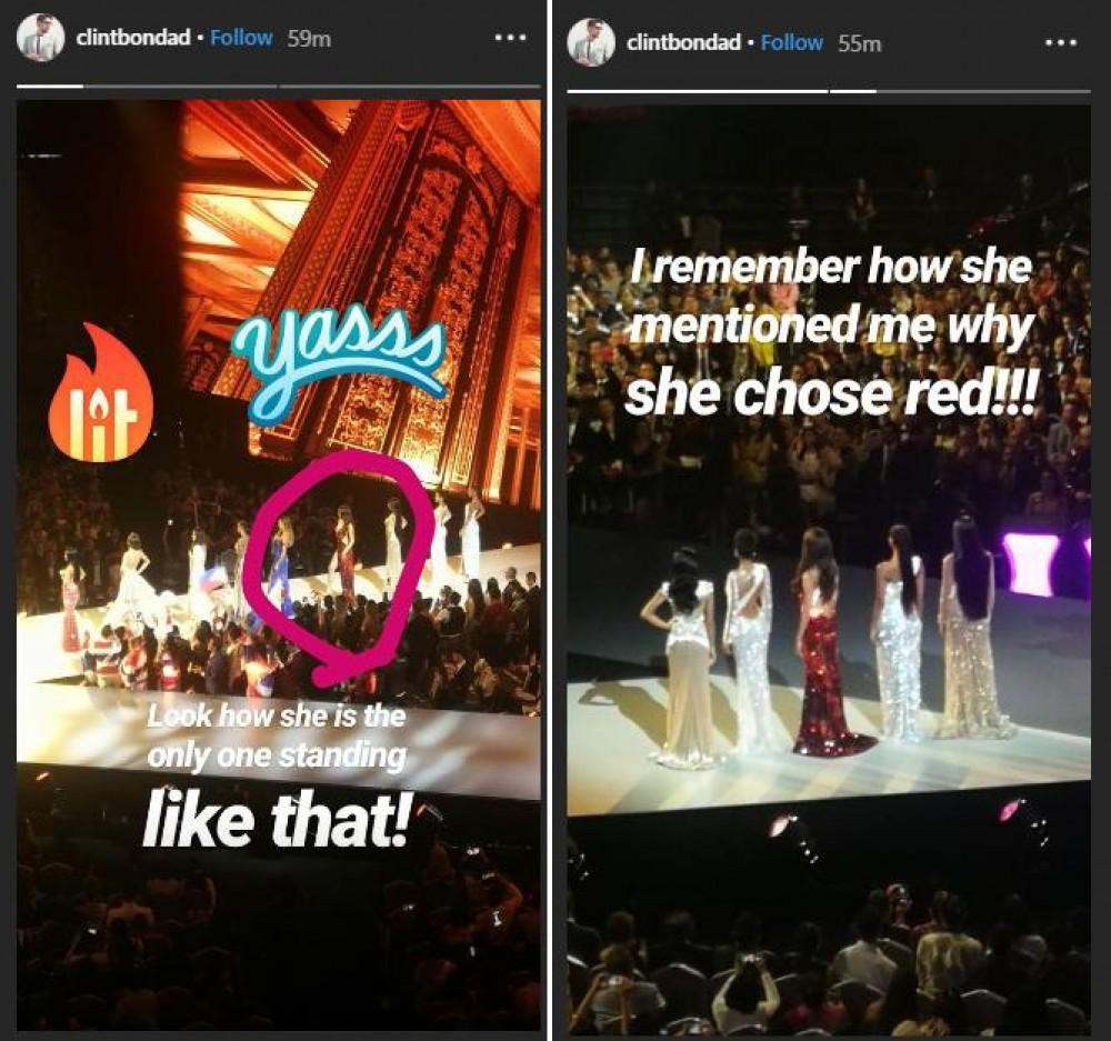Clint also shared via his Instagram stories a couple of photos while Catriona was on stage during the pageant with notes.
