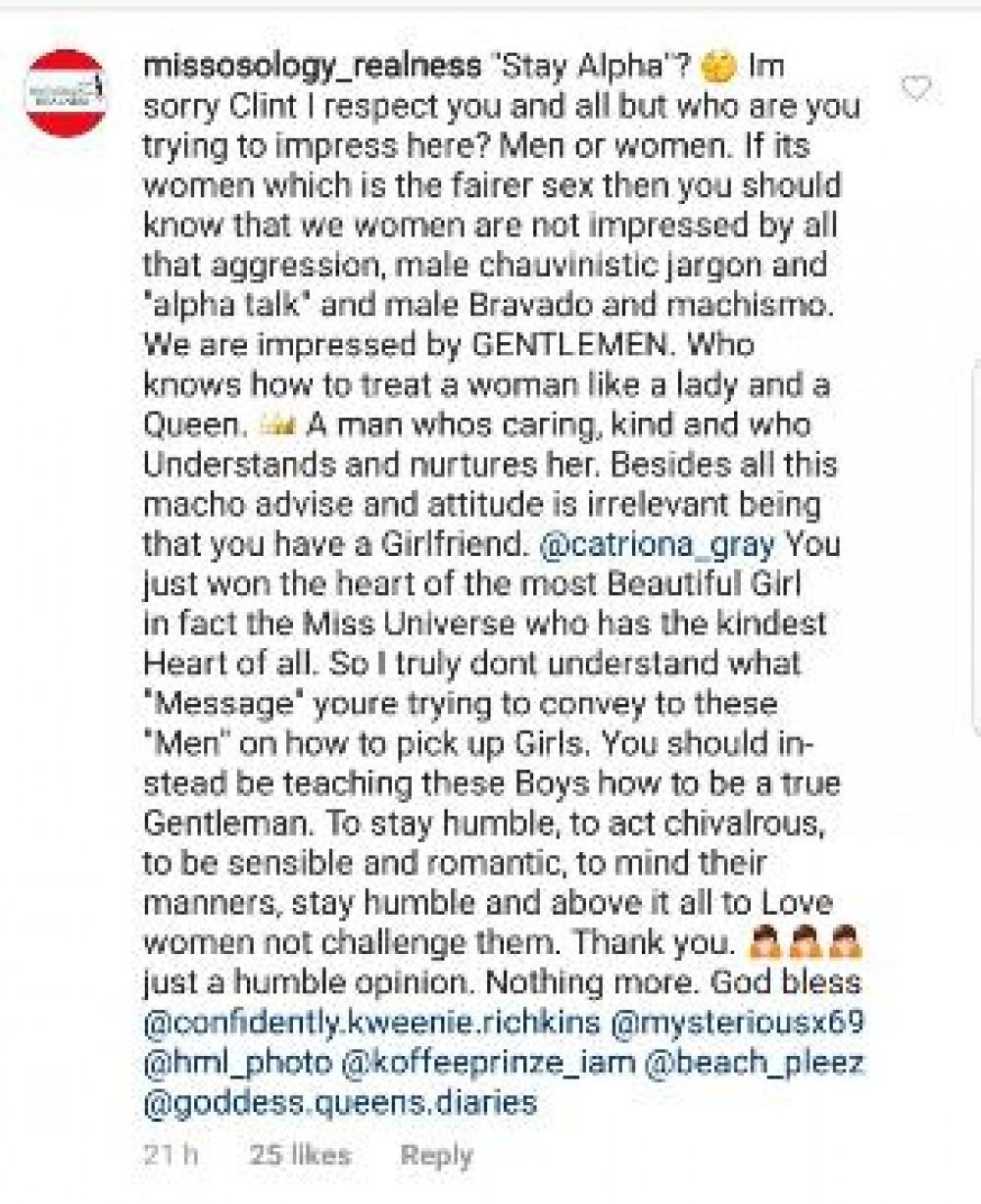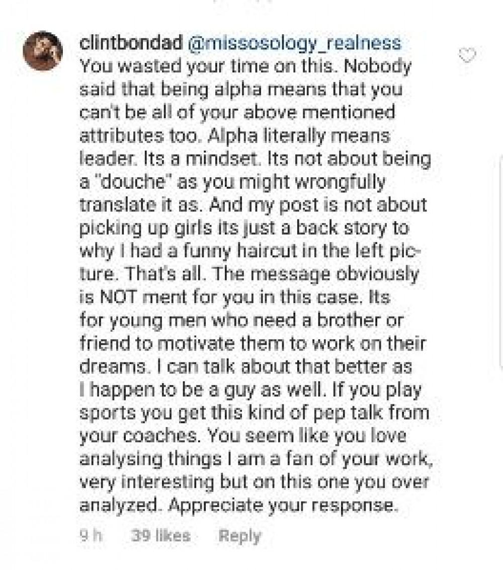 Instagram user @missosology_realness reacted to Clint's IG post and called him out for promoting the 'machismo' attitude.