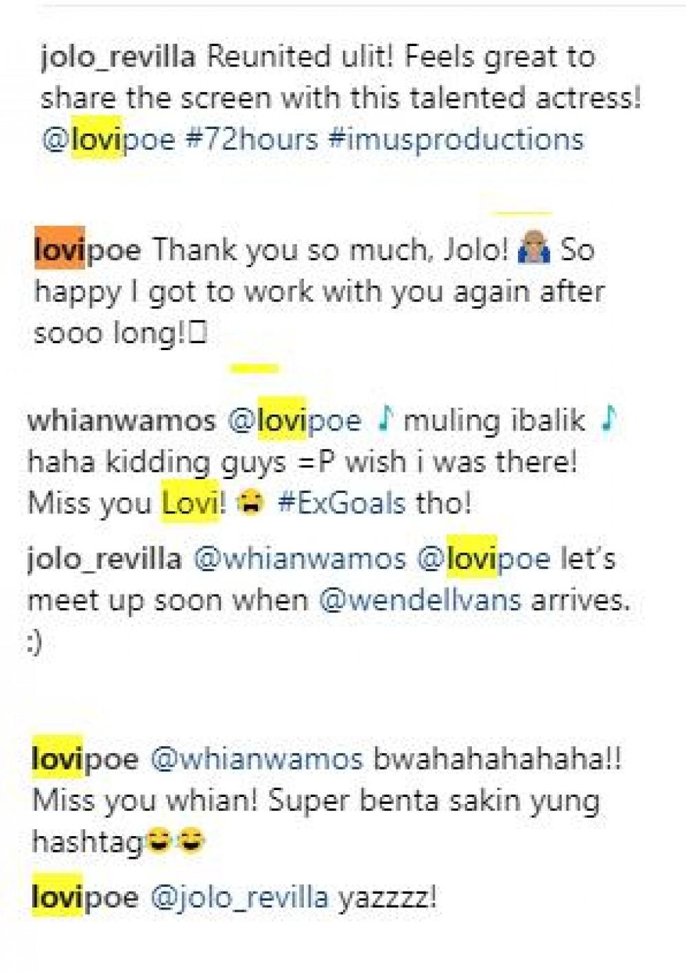 “Reunited ulit! Feels great to share the screen with this talented actress! @lovipoe #72hours #imusproductions”