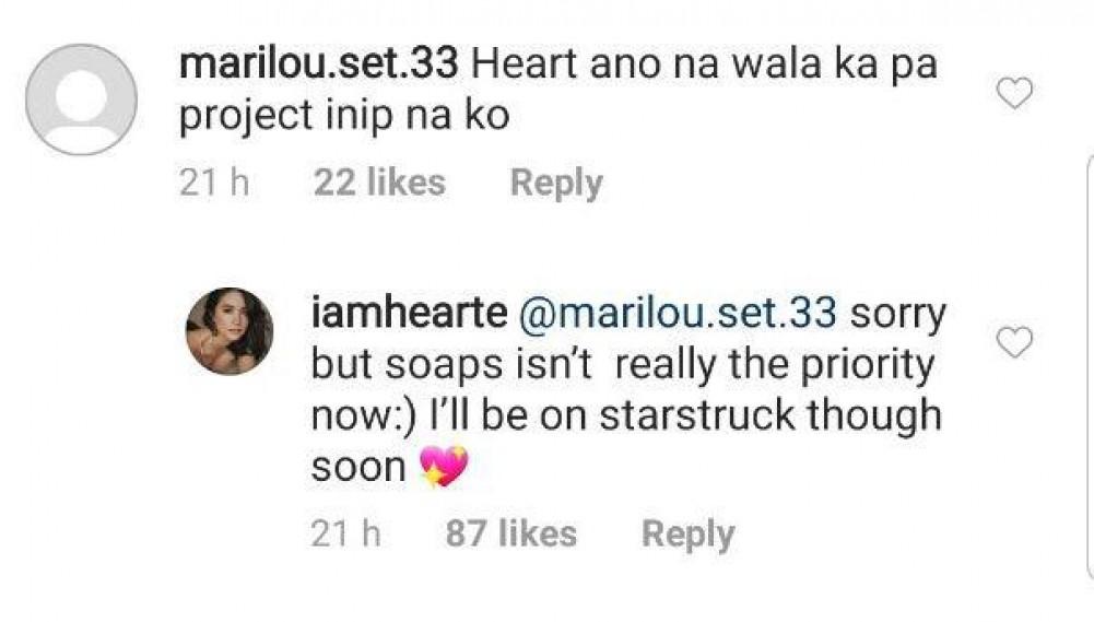 Ayon sa sagot ni Heart sa isang netizen sa Instagram, hindi niya 'priority' ang paggawa ng soap, pero dapat siyang abangan sa isang reality talent search soon sa Kapuso Network.
