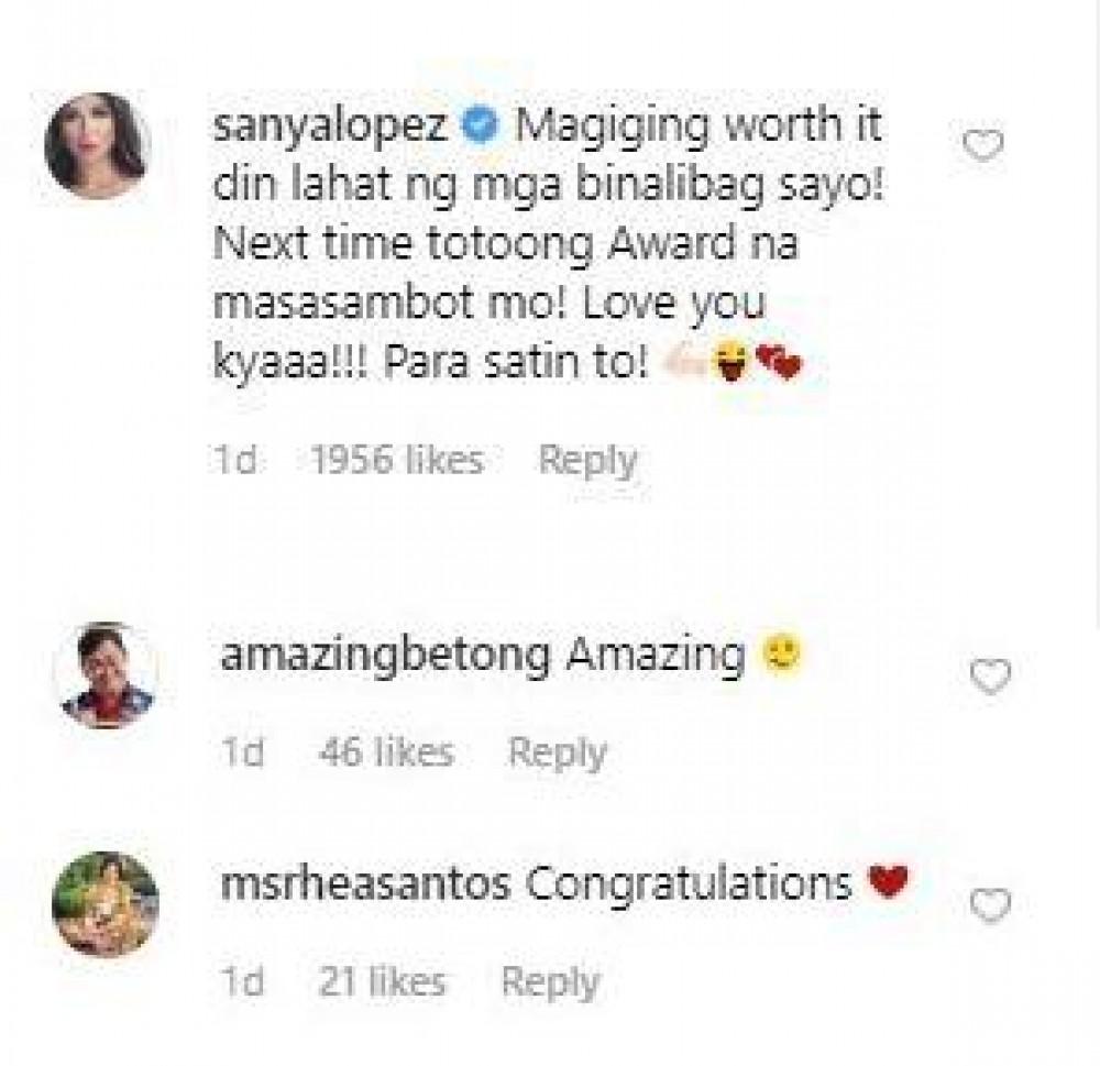Sanya Lopez replied to his brother's post saying, “Magiging worth it din lahat ng mga binabalibag sayo! Next time totoong award na masasambot mo! Love you kyaaa!!!! Para sa atin to!”
