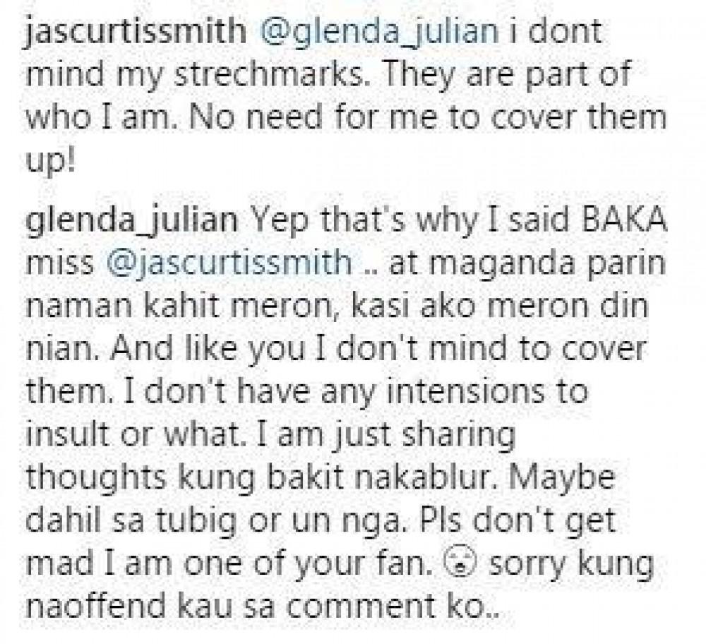 “Yep that's why I said BAKA miss @jascurtissmith .. at maganda pa rin naman kahit meron, kasi ako meron din niyan. And like you I don't mind to cover them. I don't have any intention to insult or what. I am just sharing thoughts kung bakit naka-blur. Maybe dahil sa tubig or 'yun nga. Please don't get mad I am one of your fan. Sorry kung na-offend kayo sa comment ko..”