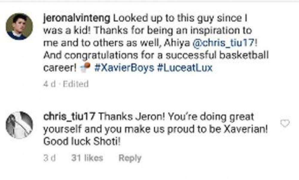 Chris Tiu thanked Jeron for his Instagram post and wished him well in his professional career in the PBA. “Thanks Jeron! You're doing great yourself and you make us proud to be Xaverian! Good luck Shoti!”
