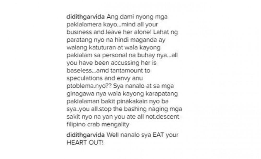Didith added, “All you have been accussing her is baseless...and tantamount to speculations and envy anu problema nyo?? Sya nanalo at sa mga ginagawa nya wala kayong karapatang pakialaman bakit pinakakain nyo ba sya..you all stop the bashing naging mga sakit nyo na yan… Well nanalo sya EAT your HEART OUT!”