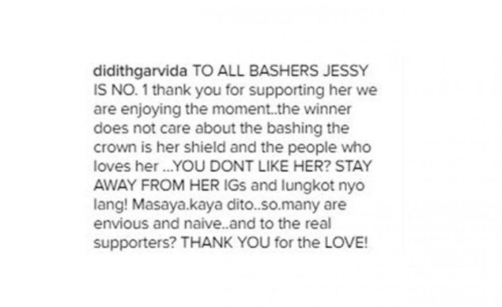 “TO ALL BASHERS JESSY IS NO. 1 thank you for supporting her we are enjoying the moment..the winner does not care about the bashing, the crown is her shield and the people who loves her ...YOU DONT LIKE HER? STAY AWAY FROM HER IGs and lungkot nyo lang! Masaya kaya dito..so many are envious and naive..and to the real supporters? THANK YOU for the LOVE!”