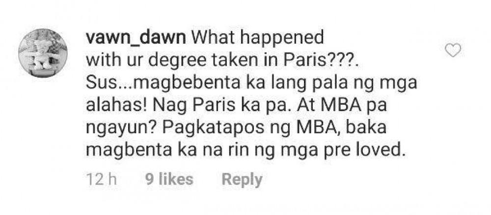 Saad ng Instagram user na si @vawn_dawn “What happened with ur degree taken in Paris??? Sus… magbebenta ka lang pala ng mga alahas!