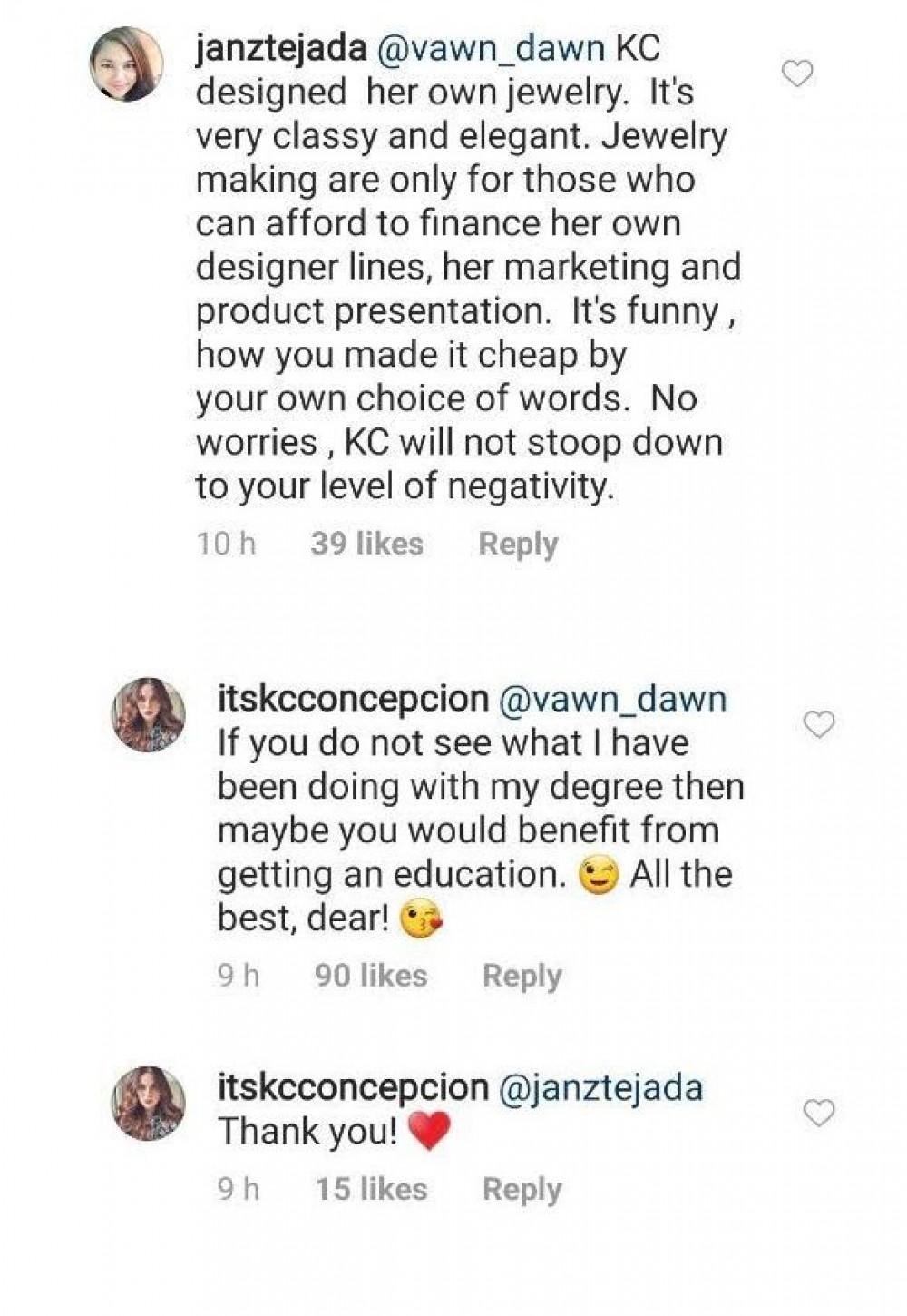 Sa kabila ng kanyang pagiging positibo, hindi napigilan ni KC na patulan ang komento ng isang internet user, na minaliit ang kanyang jewelry line.