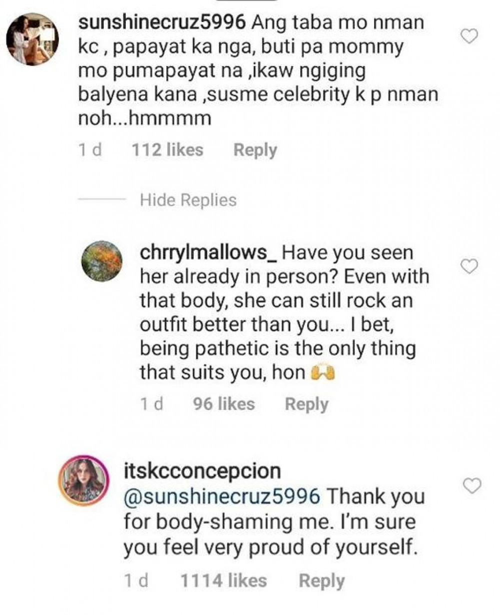 “Ang taba mo naman KC, papaya ka nga, buti pa mommy mo pumapayat na, ikaw ngiging balyena kana, susme celebrity k p nman noh.”