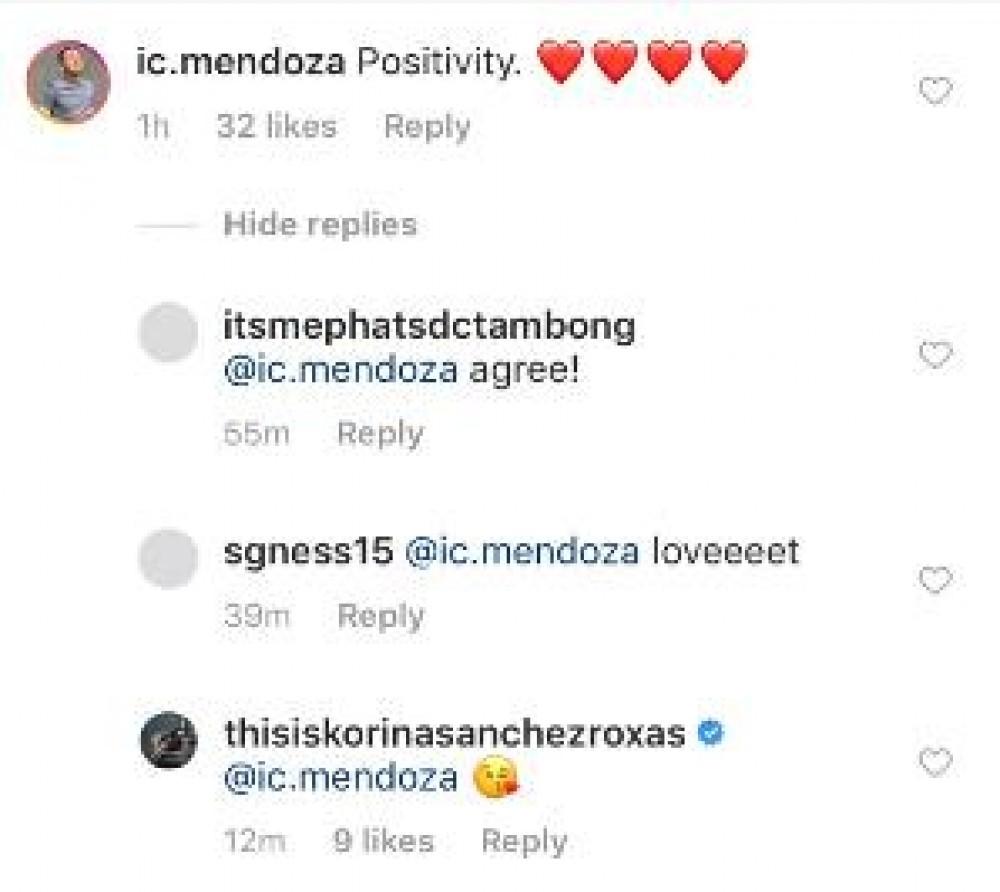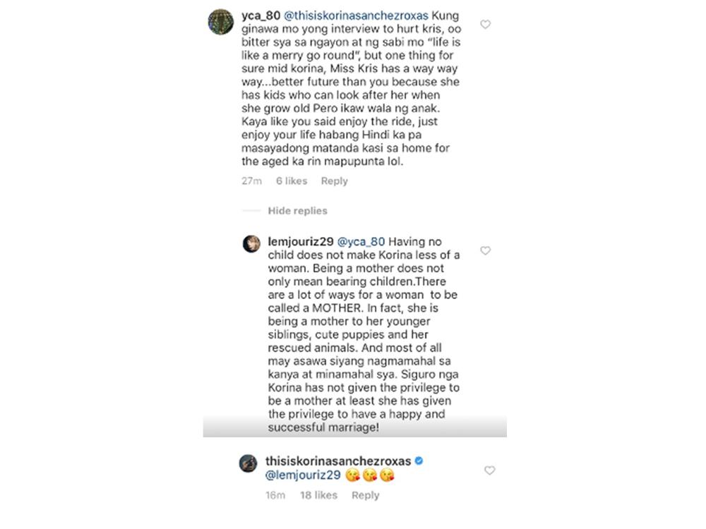 Makikita na nag-reply with three kiss emojis si Korina Sanchez sa ginawang pagtatanggol sa kaniya ni @lemjouriz29.