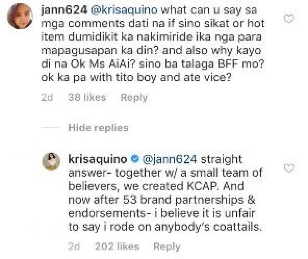 Reply ni Kris, “I believe it is unfair to say I rode on anybody’s coattails.”