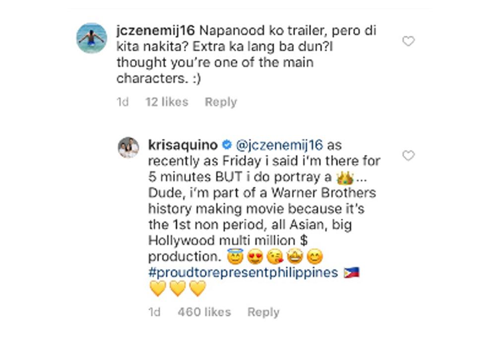 Kris reacted to a question of @jczenemij16 on her Instagram account who asked her why she was missing in the first movie trailer.