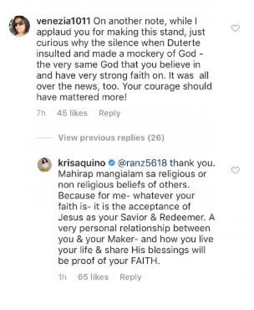 Sagot ng Queen of All Media, “Thank you. Mahirap mangialam sa religious or non-religious beliefs of others. Because for me- whatever your faith is- it is the acceptance of Jesus as your Savior & Redeemer. A very personal relationship between you & your Maker,”