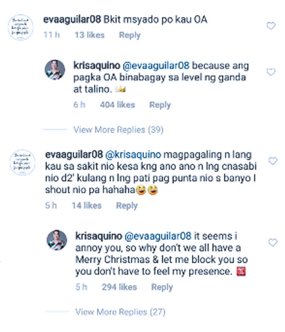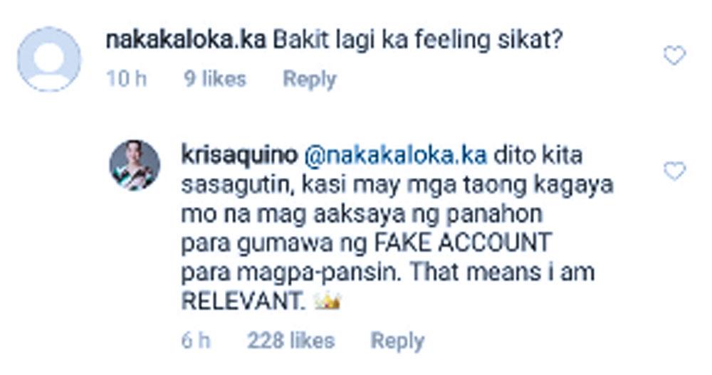 Makikita sa comment section ng Instagram account ni Kris ang mga maanghang niyang reply sa kaniyang bashers.