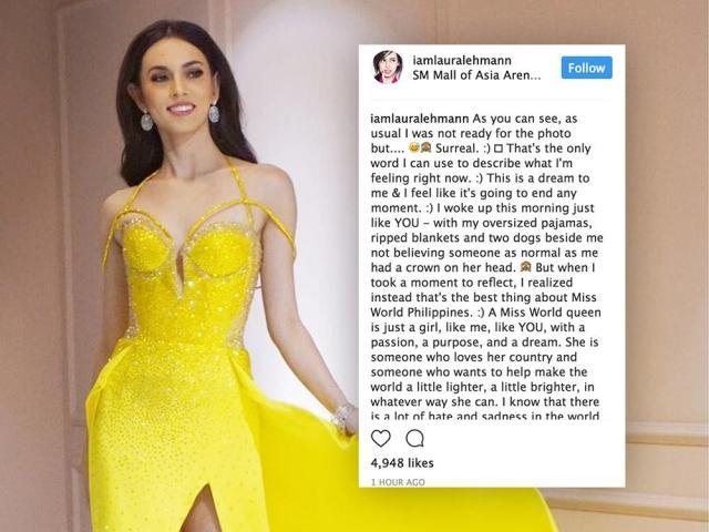 Laura posted, “As you can see, as usual, I was not ready for the photo but.... Surreal. :) ? That's the only word I can use to describe what I'm feeling right now. :) This is a dream to me & I feel like it's going to end any moment. :) I woke up this morning just like YOU - with my oversized pajamas, ripped blankets and two dogs beside me not believing someone as normal as me had a crown on her head.”